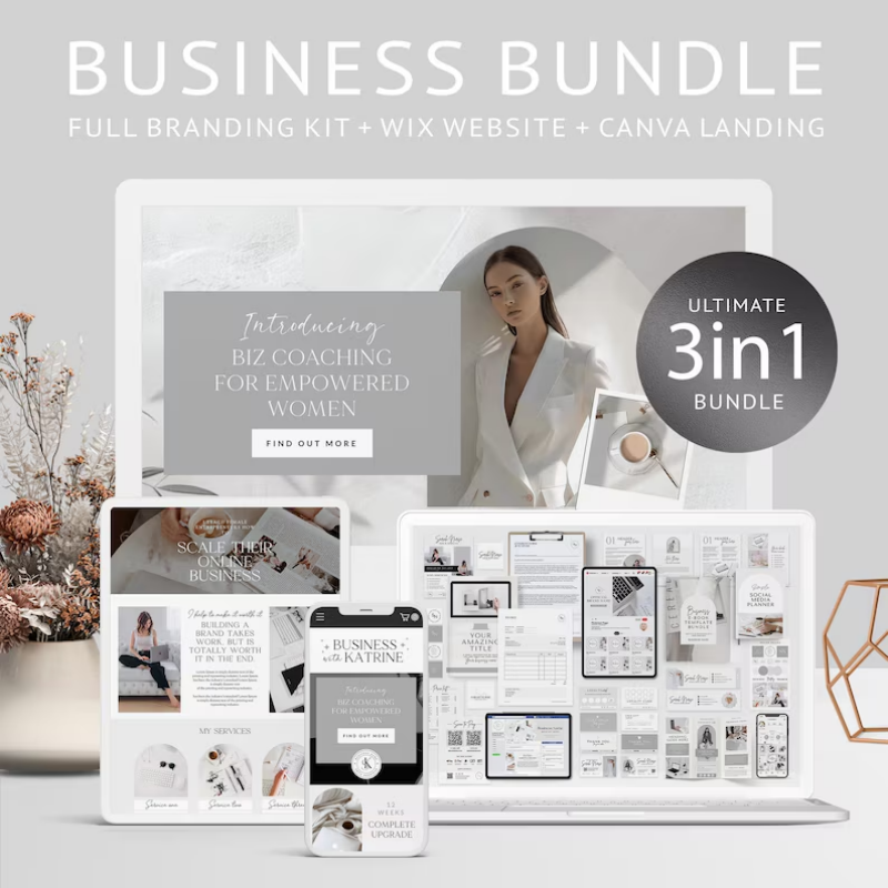 Purchase this all-in-one coaching business template kit to easily launch your entrepreneurial journey. The kit includes everything you need: a complete branding toolkit covering all the template designs you might need + a fully functional, ready-to-use Wix website + a Canva landing page.