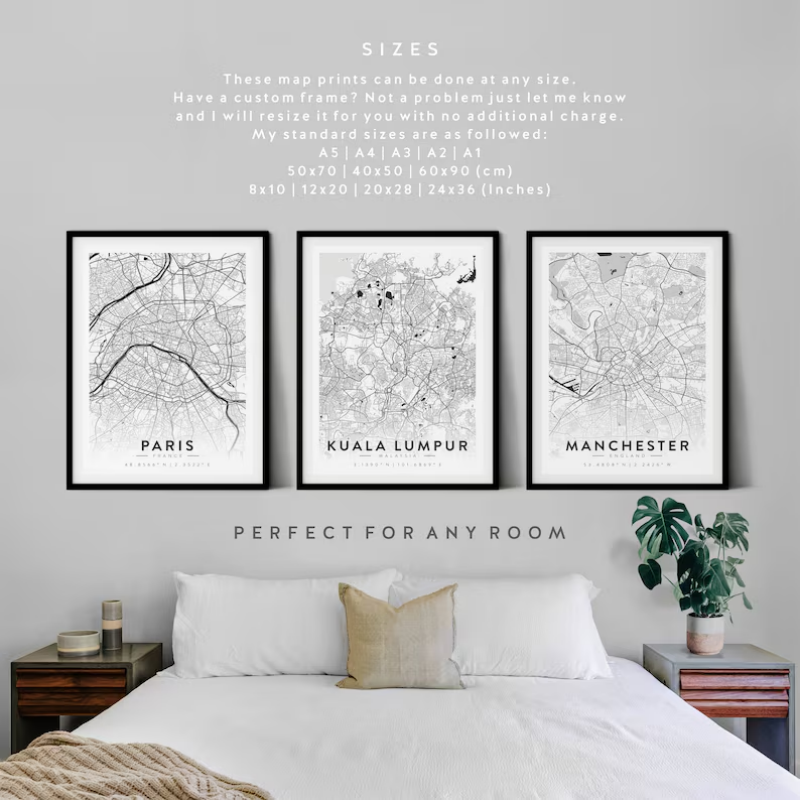 These stylish map prints are a perfect addition to your wall décor for the bedroom, lounge, office, hallway or practically any room in your home. We have many popular locations to choose from ‘as they come’ alternatively just pick your you own locations for a 100% custom design at no extra cost.