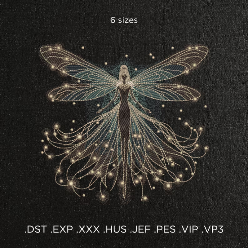 his Fairy With Wings Embroidery Design features a magical fairy in flight, beautifully captured in a shiny and unique pattern. Perfect for embroidery machines, this design adds a touch of enchantment to any project. Its intricate details and sparkling elements create a captivating and whimsical effect, ideal for adding a touch of magic to your creations✨